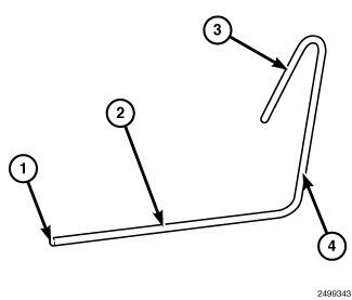 1. To install the control valve body assembly on to the transaxle case, fabricate a rod to set the pulley ratio linkage as shown. (1) 2 mm (0.08 in.) Diameter, (2) 80 mm (3 in.) long, (3) 30 mm (1 in.) long, (4) 50 mm (2 in.) long.