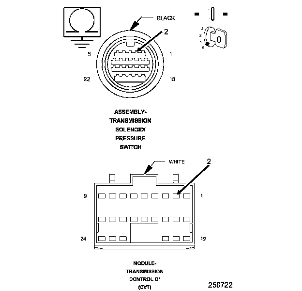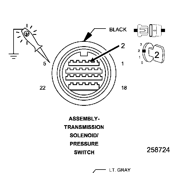 5. Using a test light connected to ground, check the (T19) Secondary Pressure Solenoid Control circuit in the Transmission Solenoid/Pressure Switch Assembly harness connector.