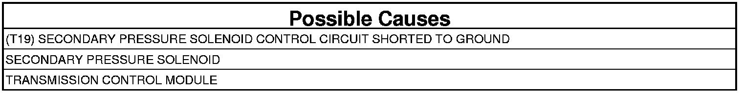 - Repair the (T19) Secondary Pressure Solenoid Control circuit for a short to ground.