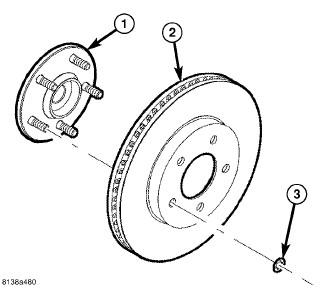 5. Remove any clips (3) retaining the brake rotor (2) to the wheel studs.
