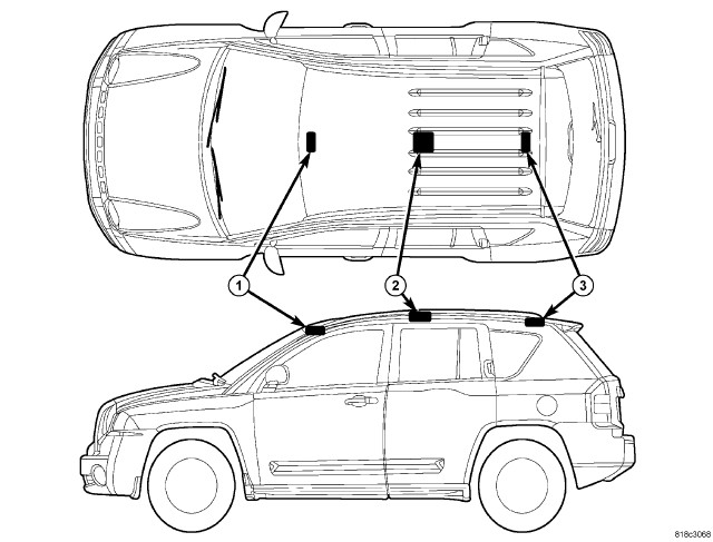 - Rear Dome Lamp (2) - A rear dome lamp is optional equipment on vehicles manufactured for domestic markets. This lamp is located near the center of the headliner over the rear seating area and is controlled by the courtesy lamp circuit. On vehicles manufactured for certain export markets where an intrusion system is a required feature of the Vehicle Theft Security System (VTSS), a rear dome lamp is located near the center of the headliner over the rear seating area. This dome lamp houses an integral Intrusion Transceiver Module (ITM) and is controlled by the courtesy lamp circuit.