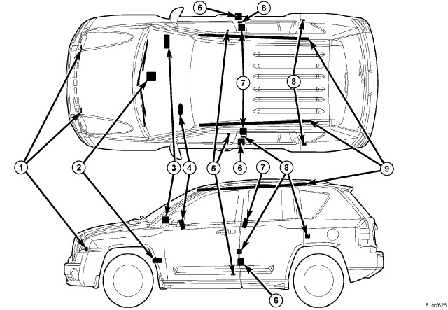 - Side Curtain Airbag (9) - A side curtain airbag is secured to each inside roof side rail above the headliner, and extends from the A-pillar to just behind the C-pillar.