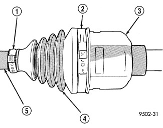 2. Remove large boot clamp (2) that retains inner tripod joint sealing boot to tripod joint housing (3) and discard. Then remove small clamp (1) that retains inner tripod joint sealing boot to interconnecting shaft (5) and discard. Remove the sealing boot (4) from the tripod housing and slide it down the interconnecting shaft.