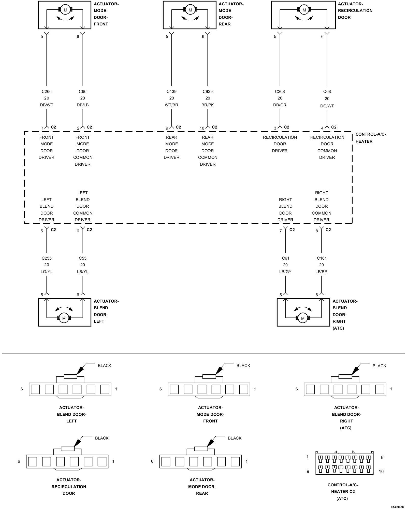 4. CHECK THE (C66) FRONT MODE DOOR COMMON DRIVER CIRCUIT FOR A SHORT TO THE (C268) RECIRCULATION DOOR DRIVER CIRCUIT, THE (C68) RECIRCULATION DOOR COMMON DRIVER CIRCUIT, THE (C255) LEFT BLEND DOOR DRIVER CIRCUIT, THE (C55) LEFT BLEND DOOR COMMON DRIVER CIRCUIT, THE (C61) RIGHT BLEND DOOR DRIVER CIRCUIT, THE (C161) RIGHT BLEND DOOR COMMON DRIVER CIRCUIT, THE (C139) REAR MODE DOOR DRIVER CIRCUIT, AND THE (C939) REAR MODE DOOR COMMON DRIVER CIRCUIT