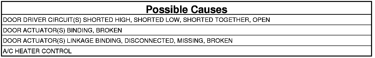 The A/C Heater Control monitors the door driver circuits during actuator operation for conditions that prevent proper door operation. If a pulse count error is detected the A/C Heater Control reports the fault as a Actuator Performance DTC. It is important to note that this DTC only indicates that a fault occurred while driving a door actuator and that additional testing is necessary to provide more details about the reported fault.