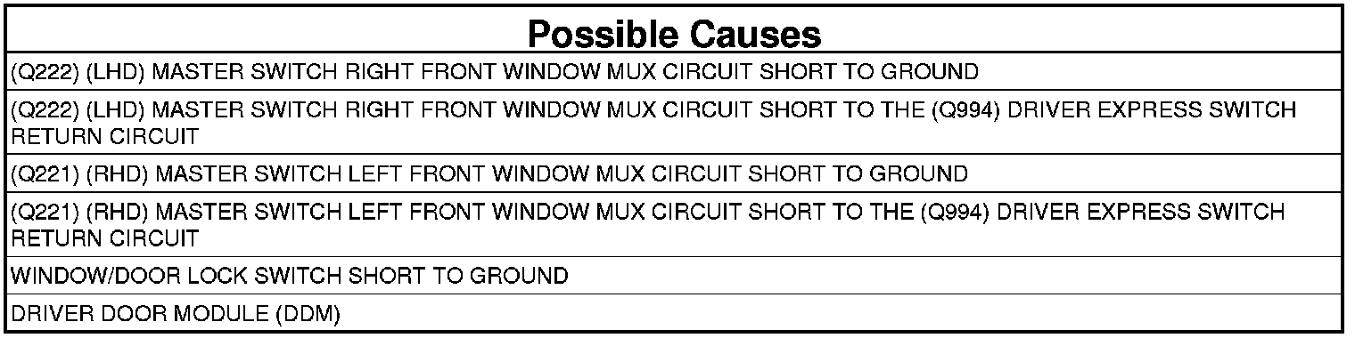 - Repair the (Q222) Master Switch Right Front Window Mux circuit for a short to the (Q994) Driver Express Switch Return circuit.