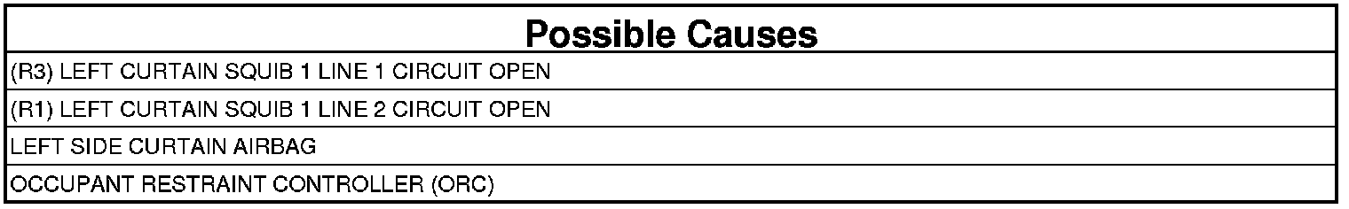- Repair the (R3) Left Curtain Squib 1 Line 1 circuit or (R1) Left Curtain Squib 1 Line 2 circuit for an open. Perform the ORC VERIFICATION TEST. Occupant Restraint Controller (ORC) Verification Test.