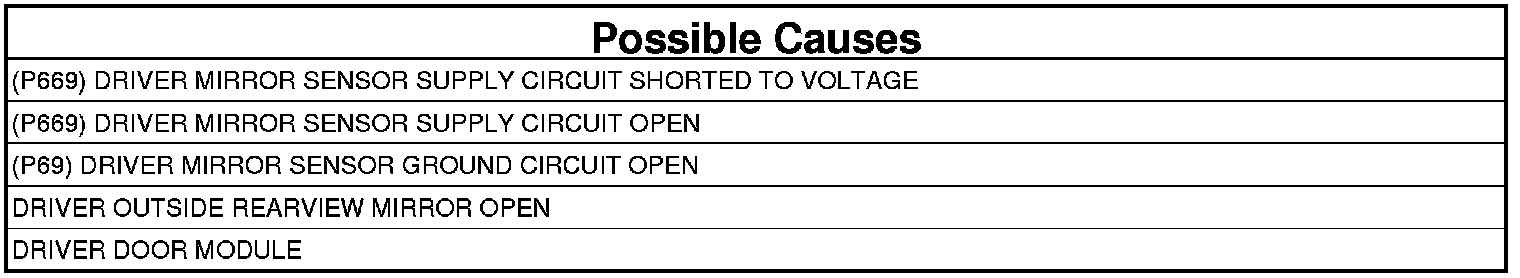 - Repair the (P669) Driver Mirror Sensor Supply circuit for an open.
