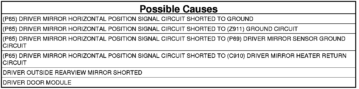 - Repair the (P65) Driver Mirror Horizontal Position Signal circuit for a short to the (C910) Driver Mirror Heater Return circuit.