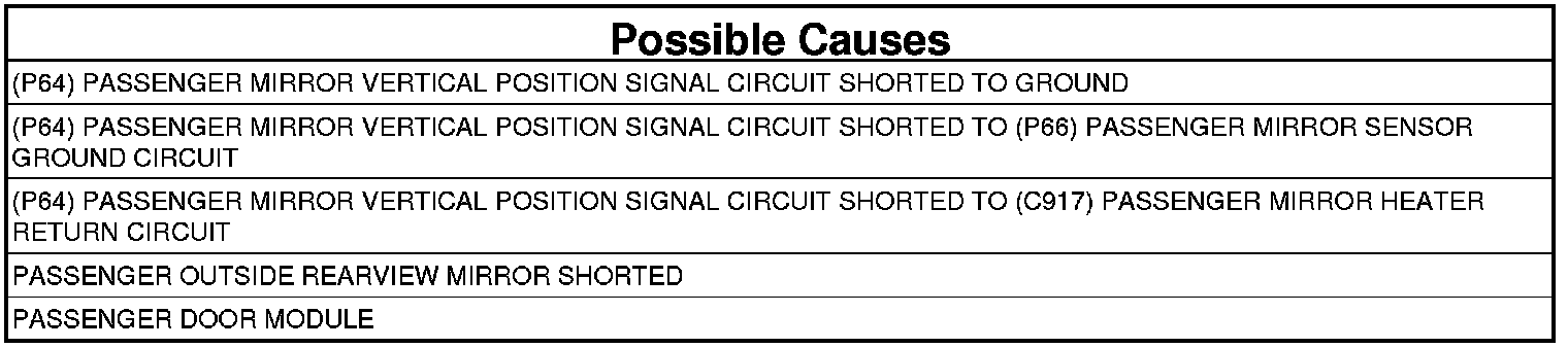 - Repair the (P64) Passenger Mirror Vertical Position Signal circuit for a short to the (C917) Passenger Mirror Heater Return circuit.