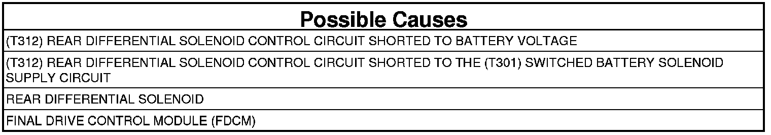 - Repair the short between the (T312) Rear Differential Solenoid Control circuit and the (T301) Switched Battery Solenoid Supply circuit.