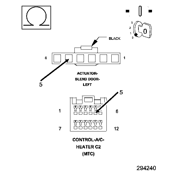 The purpose of actuator calibration is to determine the total span of door travel between physical stops. To calibrate the actuator, the A/C Heater Control first moves the door to its soft stop, and then counts the number of pulses it takes to move the door to its other stop. An expected range of span is stored in the control's memory. If the A/C Heater Control detects no commutator pulses when calibrating the left blend door, this DTC will set.