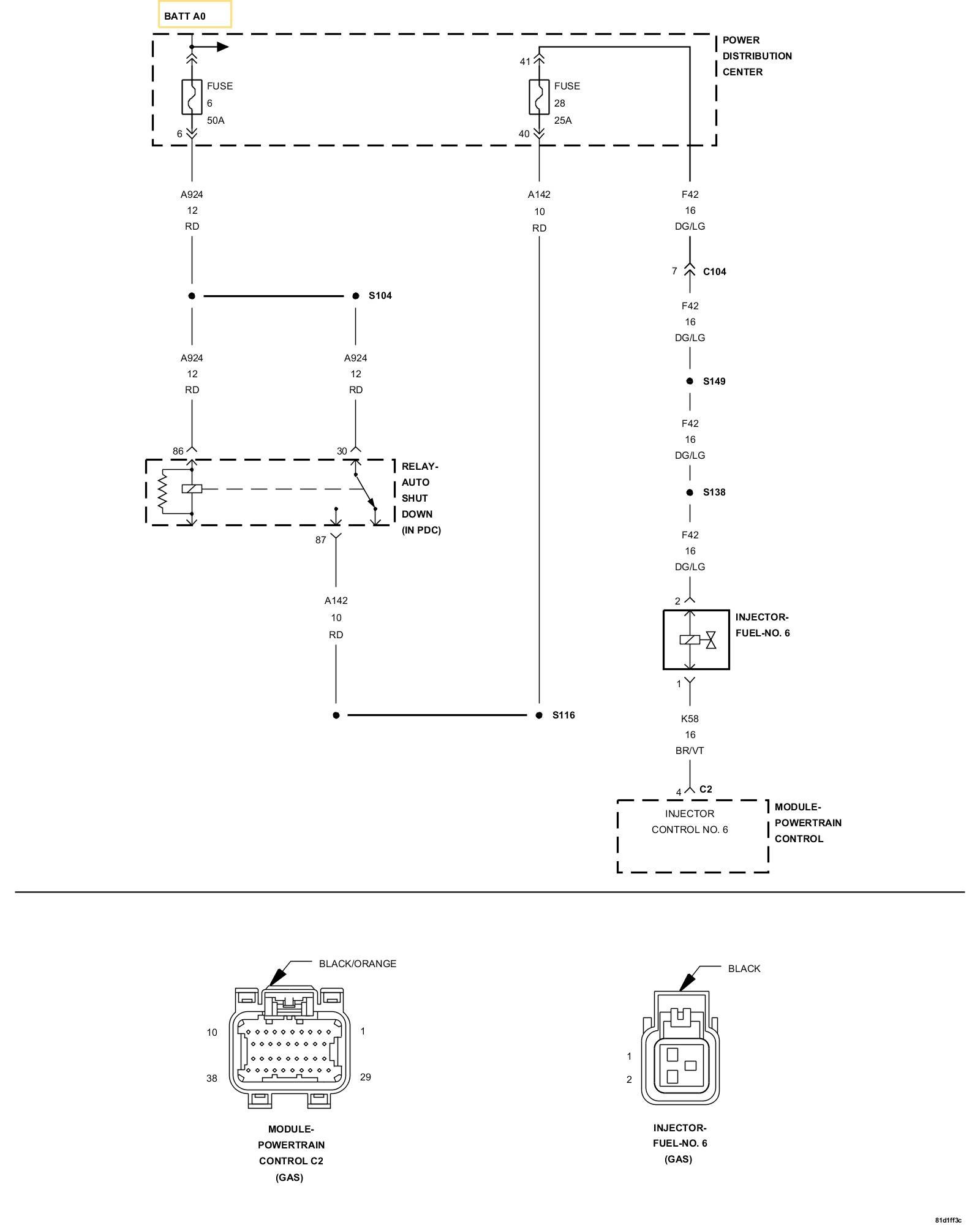 3. Using the wiring diagram/schematic as a guide, inspect the Fuel Injector 6 wiring and connector.