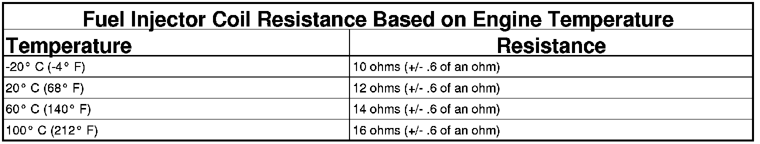 NOTE: The resistance of the circuit will vary according to the temperature of the injector coil. Use the table below to determine the resistance range of the injector.