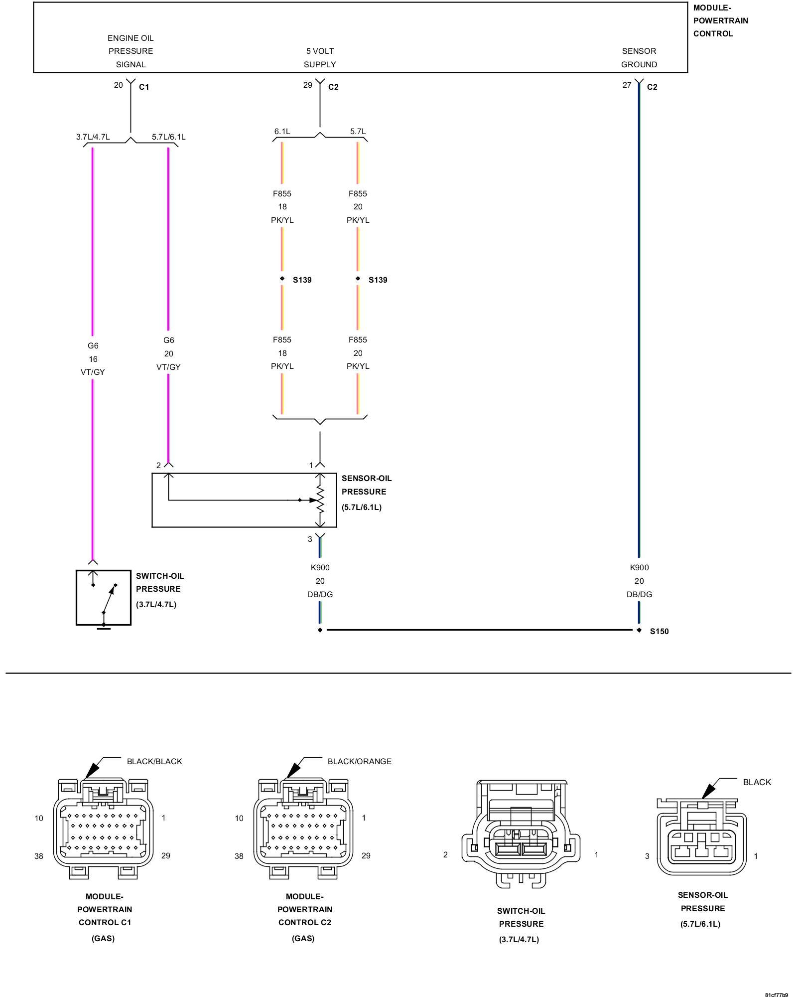 1. Using the wiring diagram/schematic as a guide, inspect the wiring and connectors between the Engine Oil Pressure Sensor and the Powertrain Control Module (PCM).