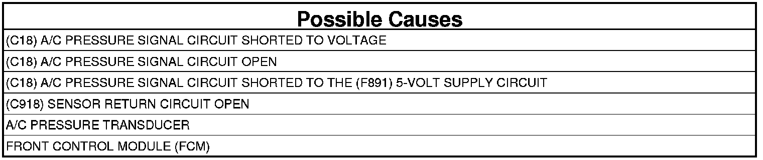 5. (C18) A/C PRESSURE SIGNAL CIRCUIT SHORTED TO THE (F891) 5-VOLT SUPPLY CIRCUIT