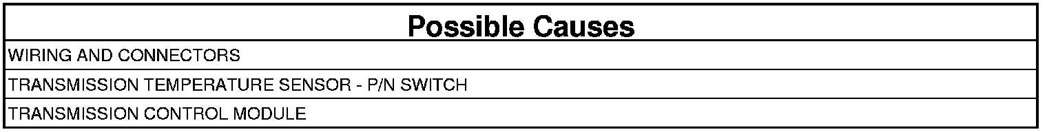 The Electrohydraulic Control Unit Assembly of the NAG1 transmission contains a temperature sensor to monitor the transmission oil temperature. This sensor is wired in series with the transmission Park/Neutral switch. The Transmission Control Module (TCM) expects to see a valid voltage level from the sensor when the shifter is in Reverse or any forward Drive position. The TCM also expects to see an open circuit condition when the shifter is in the Park or Neutral position. When the controller detects an open circuit when in Reverse or any forward drive position the DTC will set. Note: The TCM substitutes the Transmission Temperature reading with Engine Temperature due to a open circuit condition in Park or Neutral.