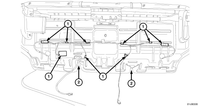 4. For 2nd row heated seats connect the new heating element electrical connectors. NOTE: Make certain the seat wire harness is correctly routed through the seat and seat back. All wire harness routing clips should be correctly installed (1) and the harness leads for the 2nd row seat back should be positioned in the proper cushion opening (2).