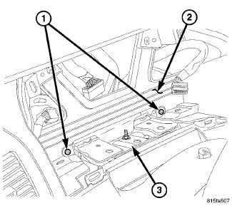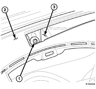 4. Through the defroster grille opening, install the nut (1) that secures the top of the instrument panel (2) to the dash panel (3). Tighten the nut to 11 Nm (97 in. lbs.).