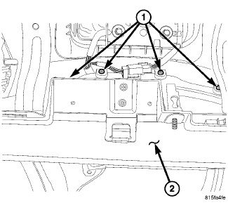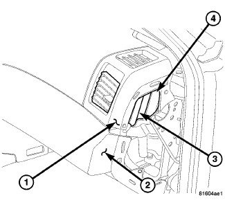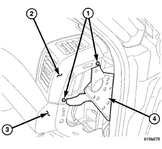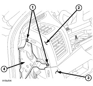 8. Install the two screws (1) located near the glove box striker (2) that secure the lower instrument panel cover (3) to the instrument panel support (4). Tighten the screws to 2.2 Nm (20 in. lbs.).