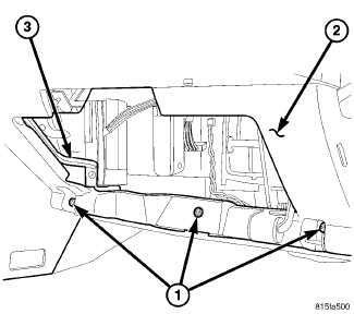 9. Install the three screws (1) that secure the lower instrument panel cover (2) to the bottom of the instrument panel support (3). Tighten the screws to 2.2 Nm (20 in. lbs.).