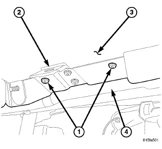 5. Install the screws (1) that secure the upper instrument panel cover (2) and the lower instrument panel cover (3) to the passenger side end of the instrument panel support (4). Tighten the screws to 2.2 Nm (20 in. lbs.).
