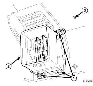 2. Through the glove box opening, install the three screws (1) that secure the air outlet (2) to the back side of the instrument panel top cover (3). Tighten the screws to 2 Nm (17 in. lbs.).