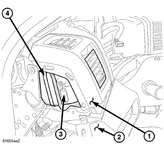 1. Carefully separate the upper instrument panel cover (1) from the lower instrument panel cover (2) and install the outboard instrument panel air outlet (3) through the glove box opening and connect it to the duct (4).
