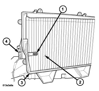 The evaporator temperature sensor (1) measures the temperature of the conditioned air downstream of the A/C evaporator (2). The evaporator temperature sensor is an electrical thermistor within a molded plastic case that is inserted into the HVAC housing (3) near the coldest point of the A/C evaporator. Two terminals within the connector receptacle (4) connect the sensor to the vehicle electrical system through a wire lead and connector of the HVAC wire harness.