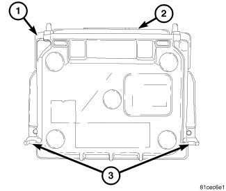 Vehicles equipped with the optional High Intensity Discharge (HID) headlamps have an electronic ballast module (1) mounted to the underside of each front lamp unit. The electronic circuitry of the module is contained within a die cast aluminum module housing, which is secured by two screws through two integral mounting lugs (3) to the molded plastic front lamp unit housing.