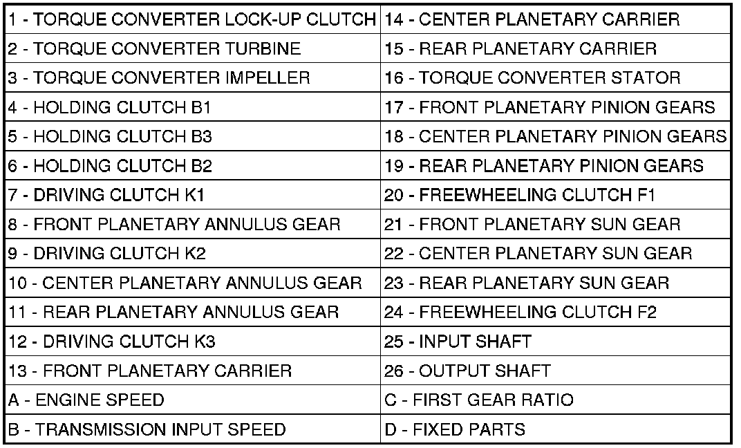 Torque from the torque converter is increased via the input shaft (25) and the center and rear planetary gearset and transferred to the output shaft (26).
