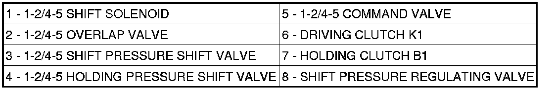 With the engine started and the gearshift lever in the NEUTRAL or PARK positions, holding clutch B1 (1) and driving clutch K3 (4) are applied and the various valves in the 1-2/4-5 shift group are positioned to apply pressure to the holding clutch B2.