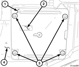 1. Position the Automatic Headlamp Leveling Module (AHLM) (2) close enough to the receptacle on the bottom of the right front lamp unit housing (4) to reconnect the front lamp unit wire harness connector to the connector receptacle on the upward-facing side of the AHLM.