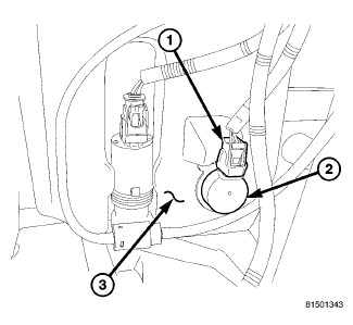 6. Disconnect the headlamp and dash wire harness connector (1) for the washer fluid level switch from the switch connector receptacle.