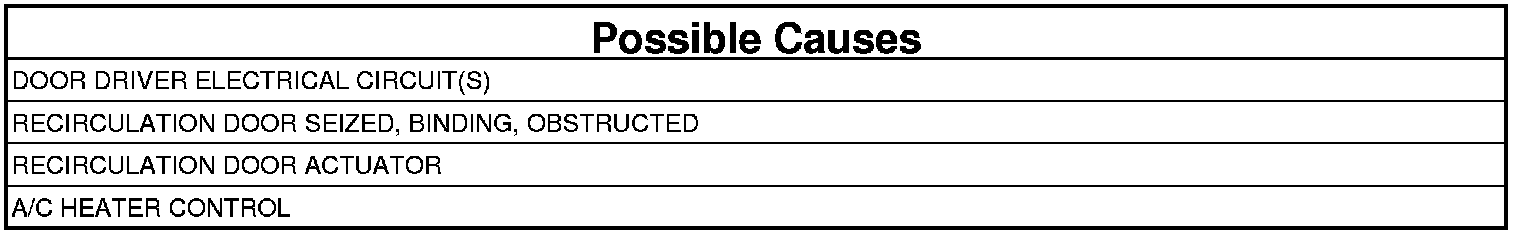 The A/C Heater Control calibrates each actuator individually. Automatic calibration occurs upon power up after installing a new A/C Heater Control. Manual calibration occurs by sending a command with the scan tool. The purpose of actuator calibration is to determine the total span of door travel between physical stops. To calibrate the actuator, the A/C Heater Control first moves the door to its soft stop, and then counts the number of pulses it takes to move the door to its other stop. An expected range of span is stored in the control's memory. If the measured calibration value is less than the expected range for this actuator, this DTC will set. Note that the control clears all stored calibration faults at the beginning of the calibration procedure.
