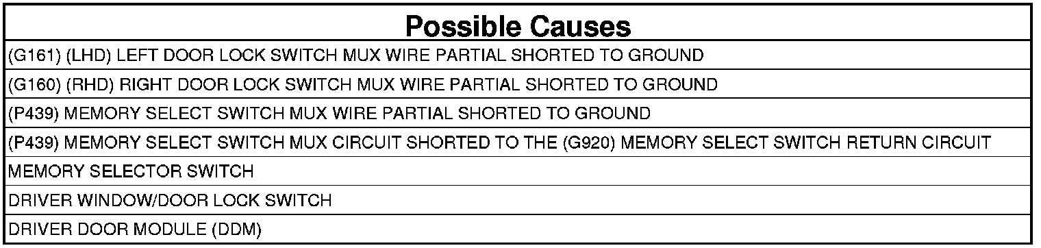 If this vehicle is equipped with the Memory System, the supply circuit for the Memory Mirrors are supplied by the Driver Door Module. Therefore, both the Memory Select Switch Mux or the Door Lock Switch Mux circuits can cause this DTC to set.