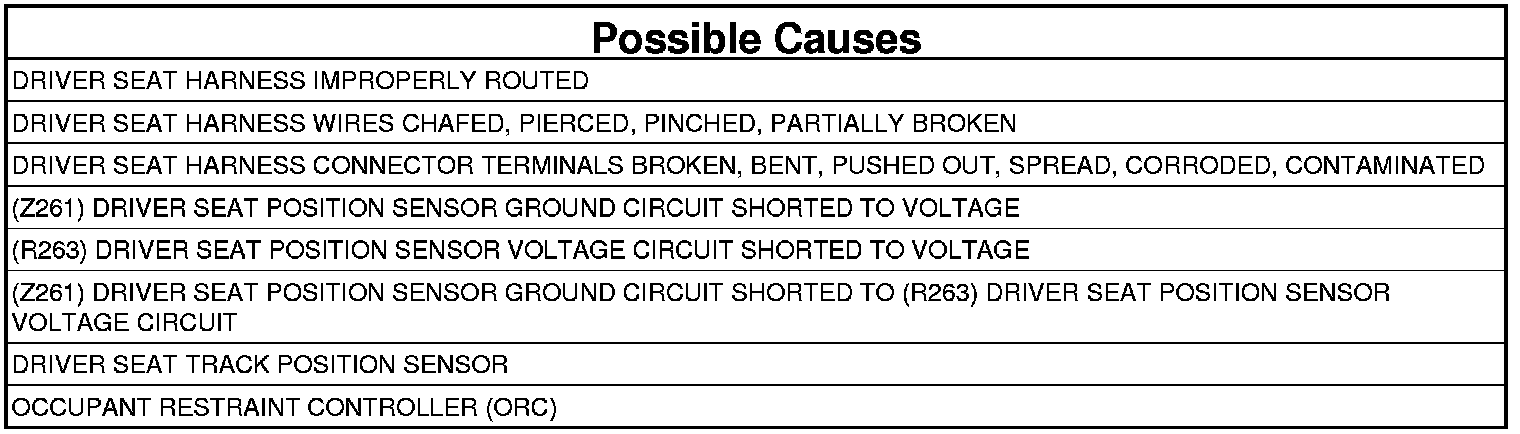 7. CHECK (Z261) DRIVER SEAT POSITION SENSOR GROUND CIRCUIT FOR A SHORT TO (R263) DRIVER SEAT POSITION SENSOR VOLTAGE CIRCUIT