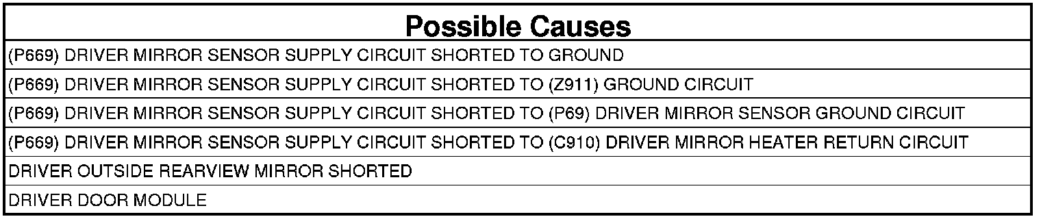 - Repair the (P669) Driver Mirror Sensor Supply circuit for a short to the (C910) Driver Mirror Heater Return circuit.