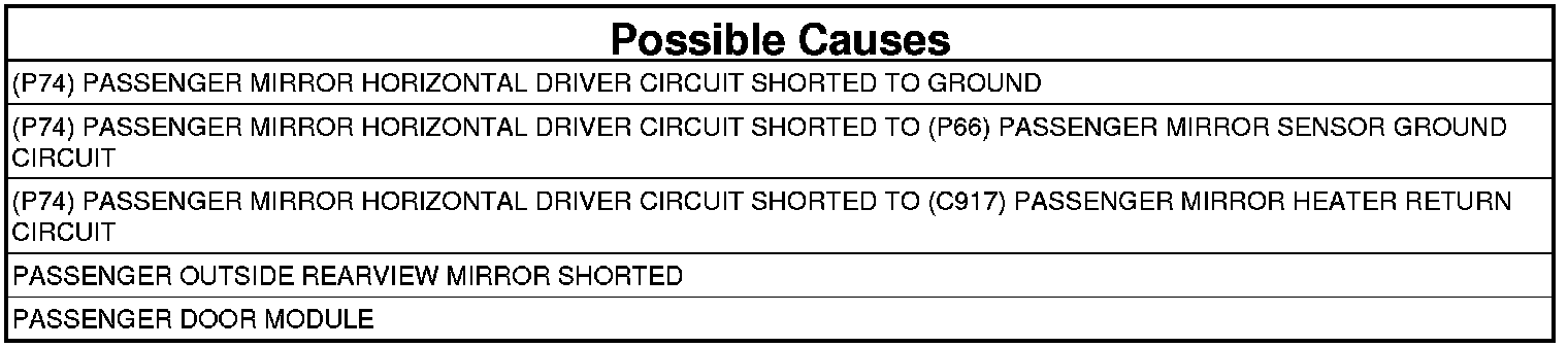- Repair the (P74) Passenger Mirror Horizontal Driver circuit for a short to the (C917) Passenger Mirror Heater Return circuit.