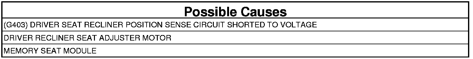 - Inspect the position sense wire for a possible intermittent short to voltage from another circuit, if OK replace the Driver Recliner Seat Adjuster Motor assembly.