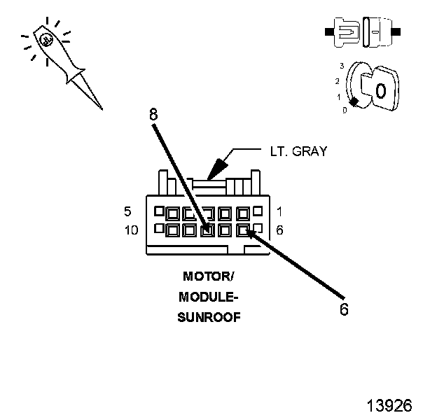 3. Test for a resisted (A932) Fused B(+) circuit by connecting a 12-volt test light between the (A932) Fused B(+) circuit and the (Z914) Ground circuit in the Sunroof Motor/Module connector. The test light must illuminate brightly. Compare the brightness to that of a direct connection to the battery.