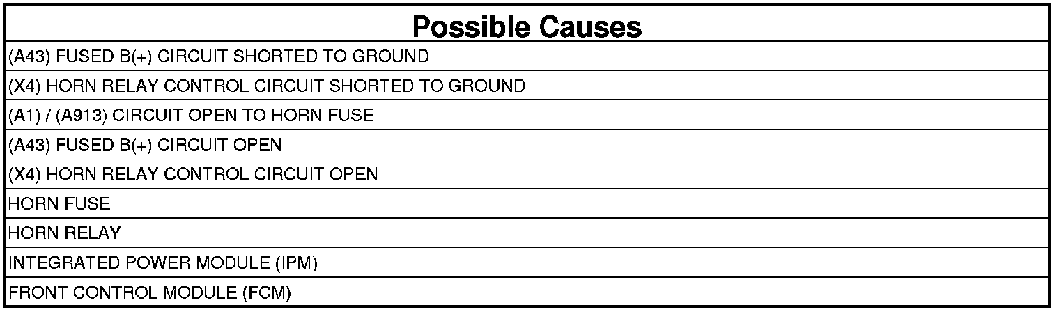 If the Front Control Module (FCM) senses either excessively low or no voltage on the (X4) Horn Relay Control circuit.