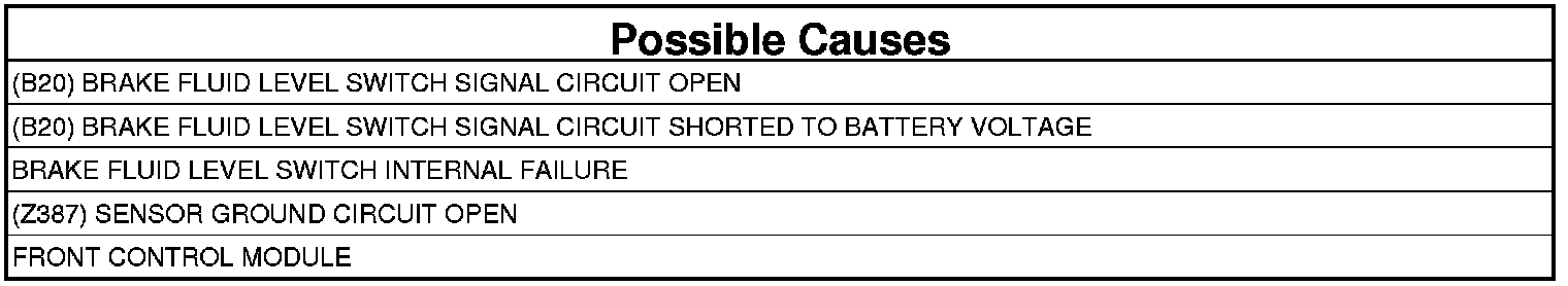 - Repair the (B20) Brake Fluid Level signal circuit for a short to voltage.