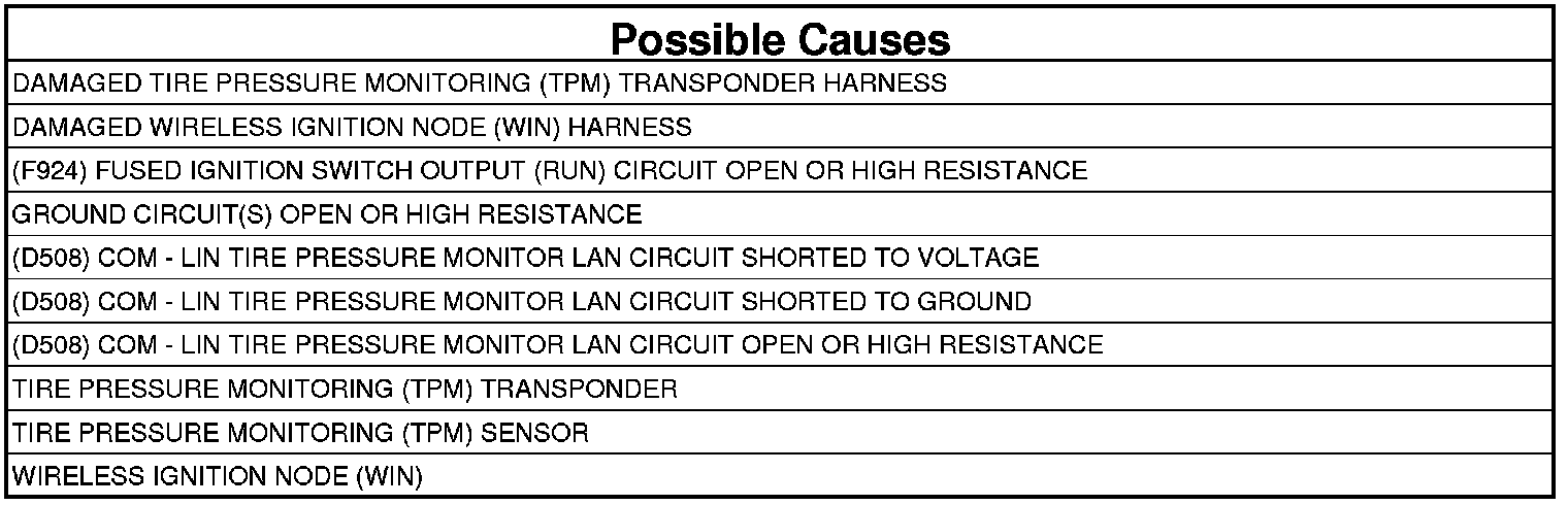 - Repair the (D508) COM - LIN Tire Pressure Monitor LAN circuit for a short to ground.