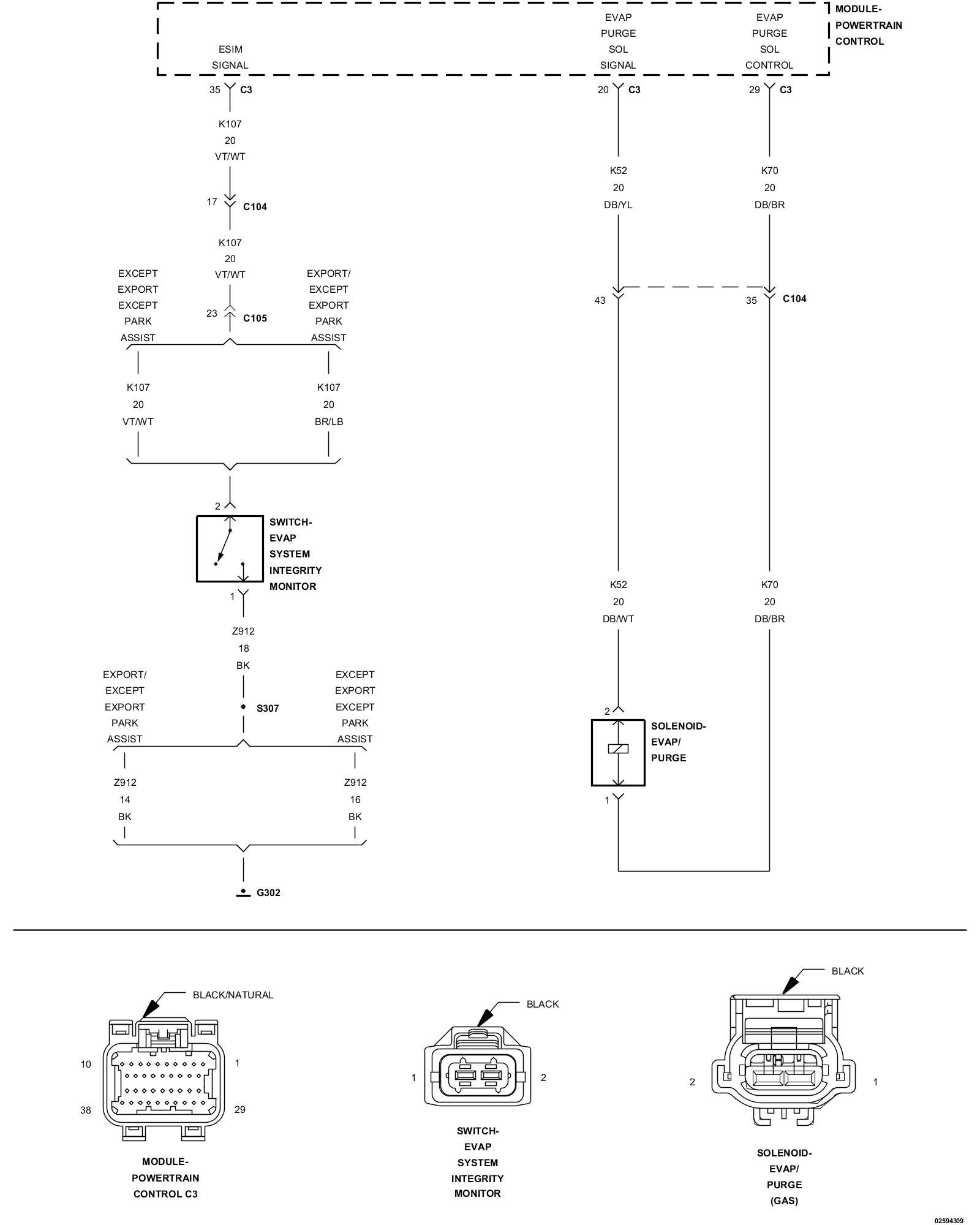 1. Using the wiring diagram/schematic as a guide, inspect the wiring and connectors between the Evap Purge Solenoid Assembly, ESIM Switch and the Powertrain Control Module (PCM).