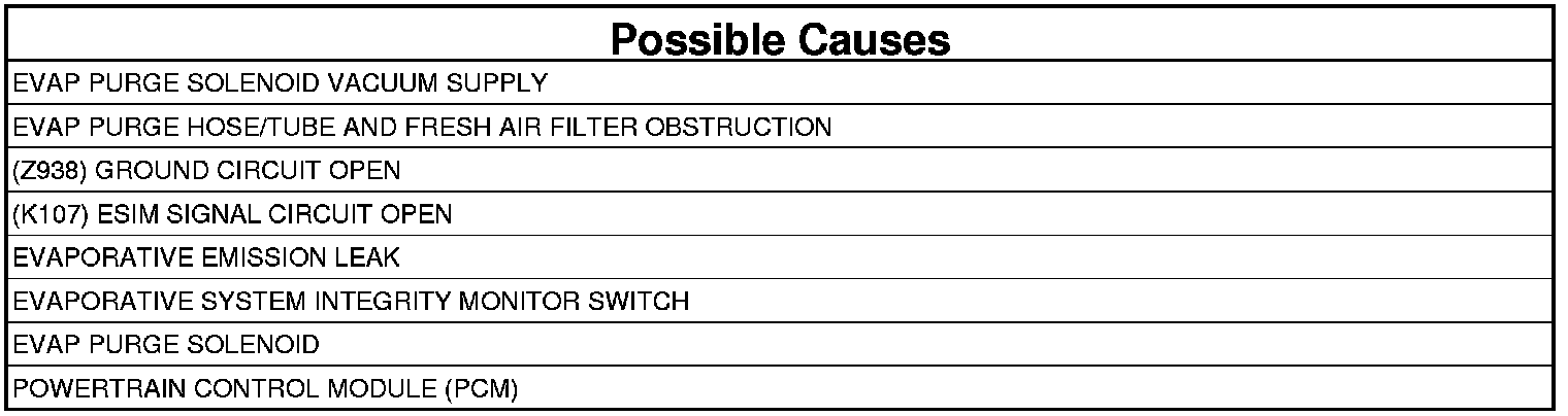 The Evaporative Purge Monitor tests the integrity of the hoses/tube between the throttle body/intake and the fuel tank. The monitor is a two stage test and runs only after the Evaporative system passes the small leak test. Stage one is non-intrusive. The Powertrain Control Module (PCM) monitors the purge vapor ratio and the Evaporative System Integrity Monitor (ESIM) Switch closed ratio. If the purge vapor ratio is above a calculated value, the monitor passes. If the ESIM Switch closed ratio is greater than calculated value when purge flow is greater than a minimum value, the monitor passes. Stage two is an intrusive test and runs only if stage one does not pass. The PCM commands the purge solenoid to flow at a specified rate to force the purge vapor ratio to update. The ratio is compared to a calibrated specification. If it is less than specified, a one trip failure is recorded. This test can detect if the purge hose is off, obstructed or the purge valve is not operational.