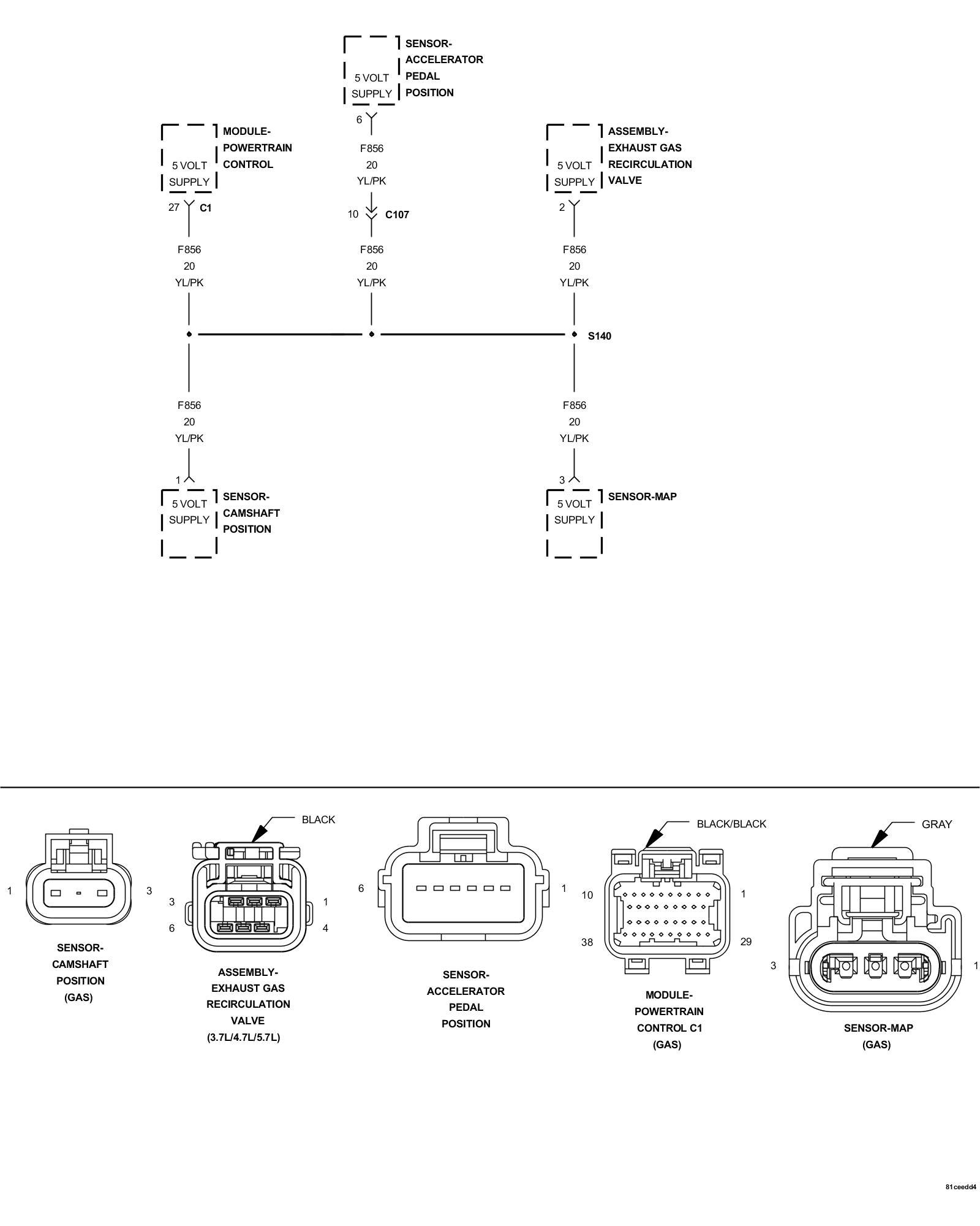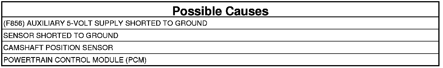 - Verify that there is good pin to terminal contact in the related Sensor and Powertrain Control Module connectors. If OK, replace the Sensor that causes the (F856) Auxiliary 5-volt Supply circuit voltage to increase when disconnected.