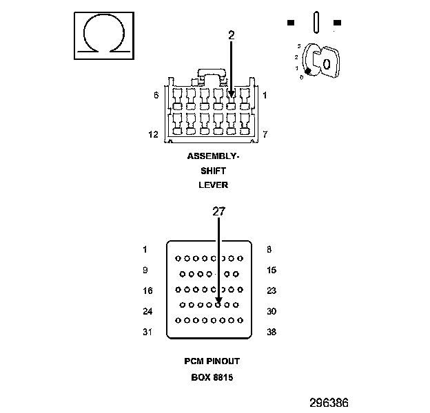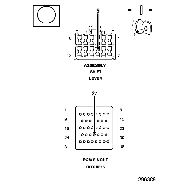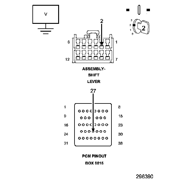 2. Measure the resistance of the (K900) Sensor Ground circuit between the Shift Lever Assembly harness connector and the appropriate terminal of the PCM Pinout Box 8815.