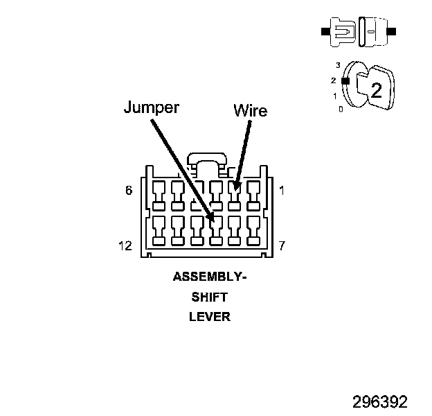 2. Connect a jumper wire between (T5) AutoStick Up/Down Sense circuit and (K900) Sensor Ground circuit in the Shift Lever Assembly harness connector.