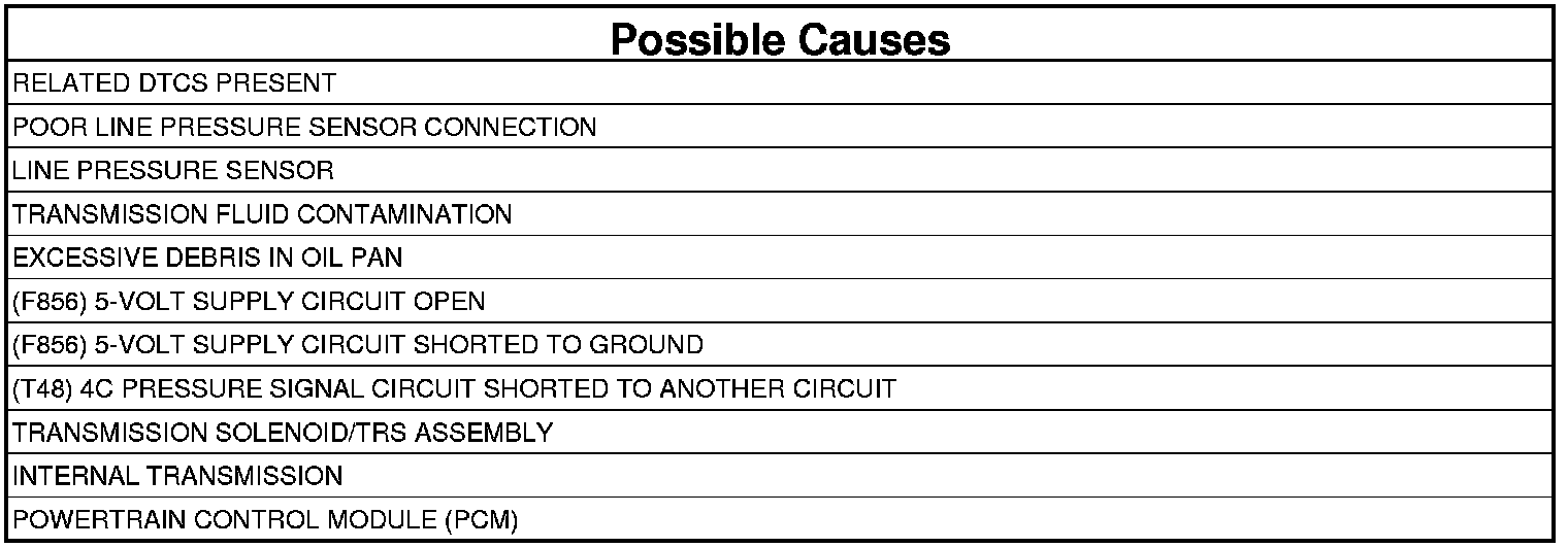 5. If the Event Data shows the DTC P0987 set while the Line Pressure was significantly below the Desired Line Pressure reading, check for causes of low line pressure (low fluid level, broken or mis-installed primary oil filter or filter seal, sticking Main Regulator Valve in the Pump Valve Body etc.). If the data shows the DTC set while the Line Pressure reading was significantly higher than the Desired Line Pressure, check the Line Pressure Sensor and related wiring.